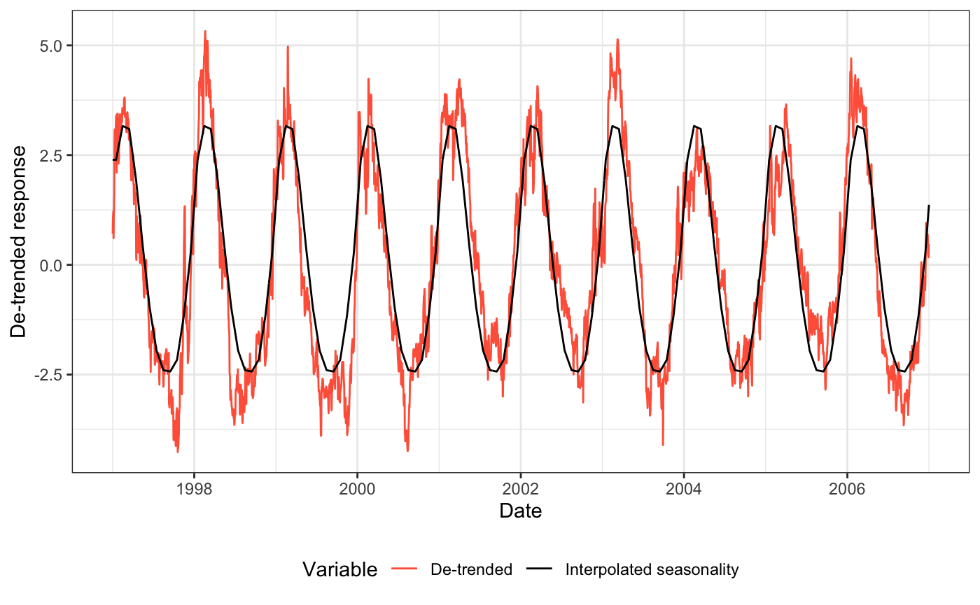 The data can be plotted using ggplot2 methods. The user can plot both the de-trended dataset overlaid with the seasonal interpolation,
